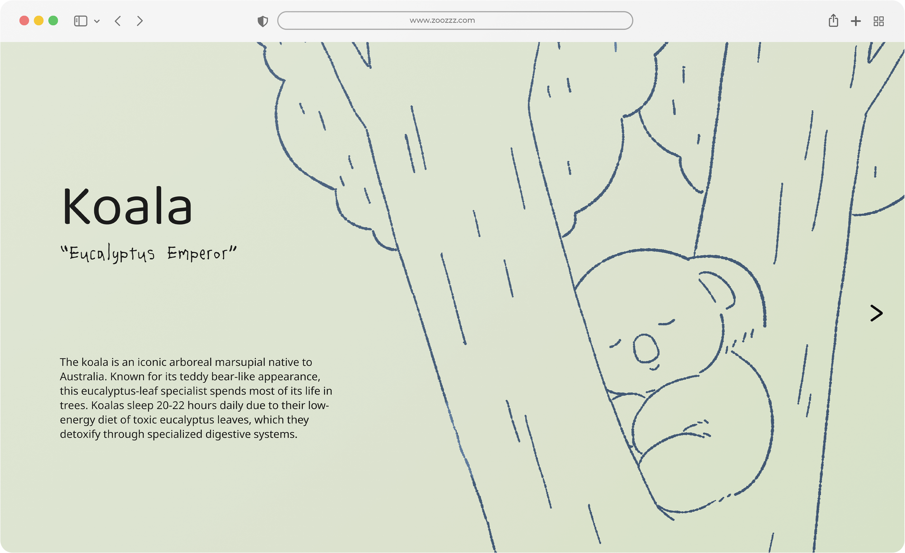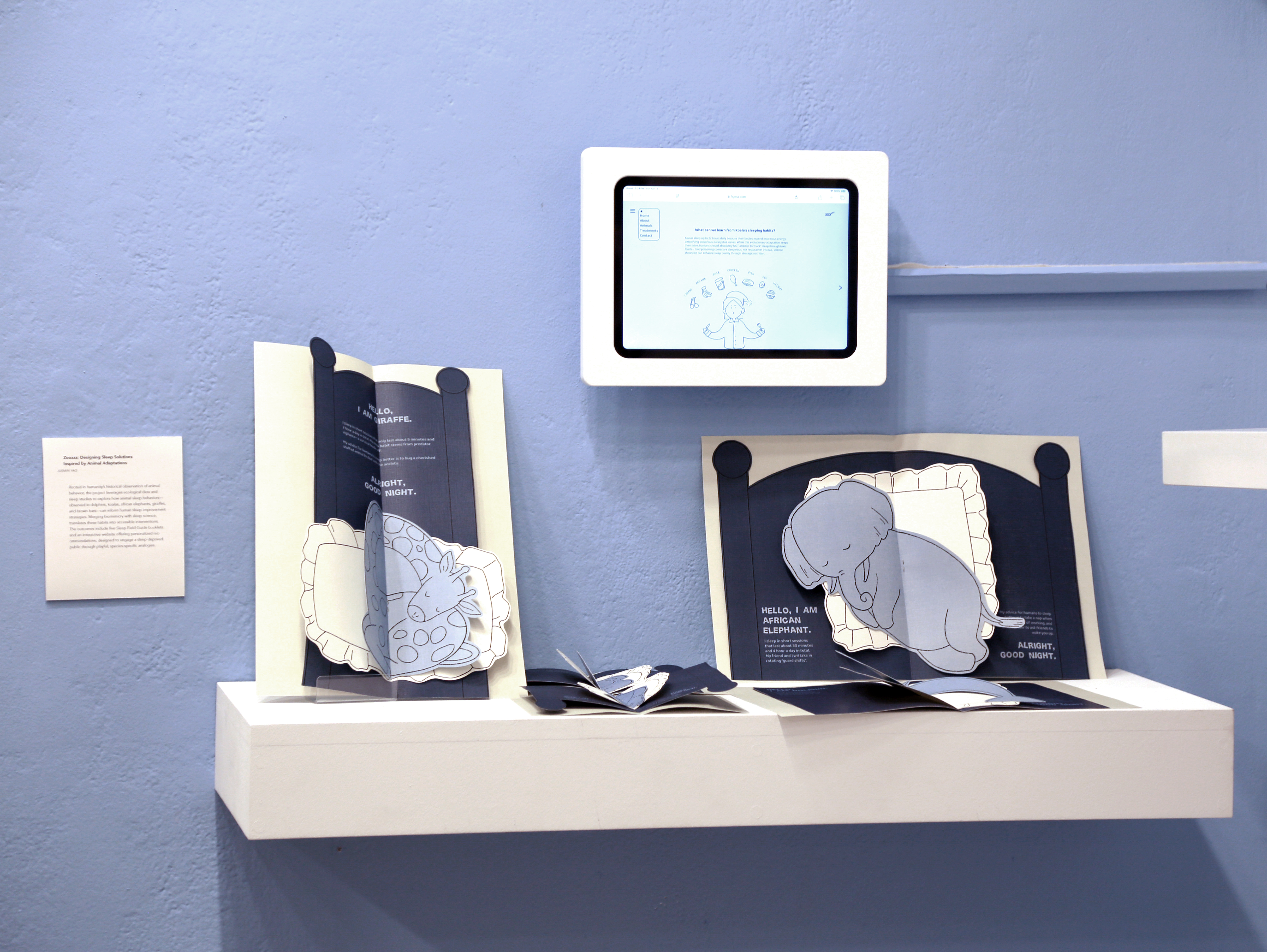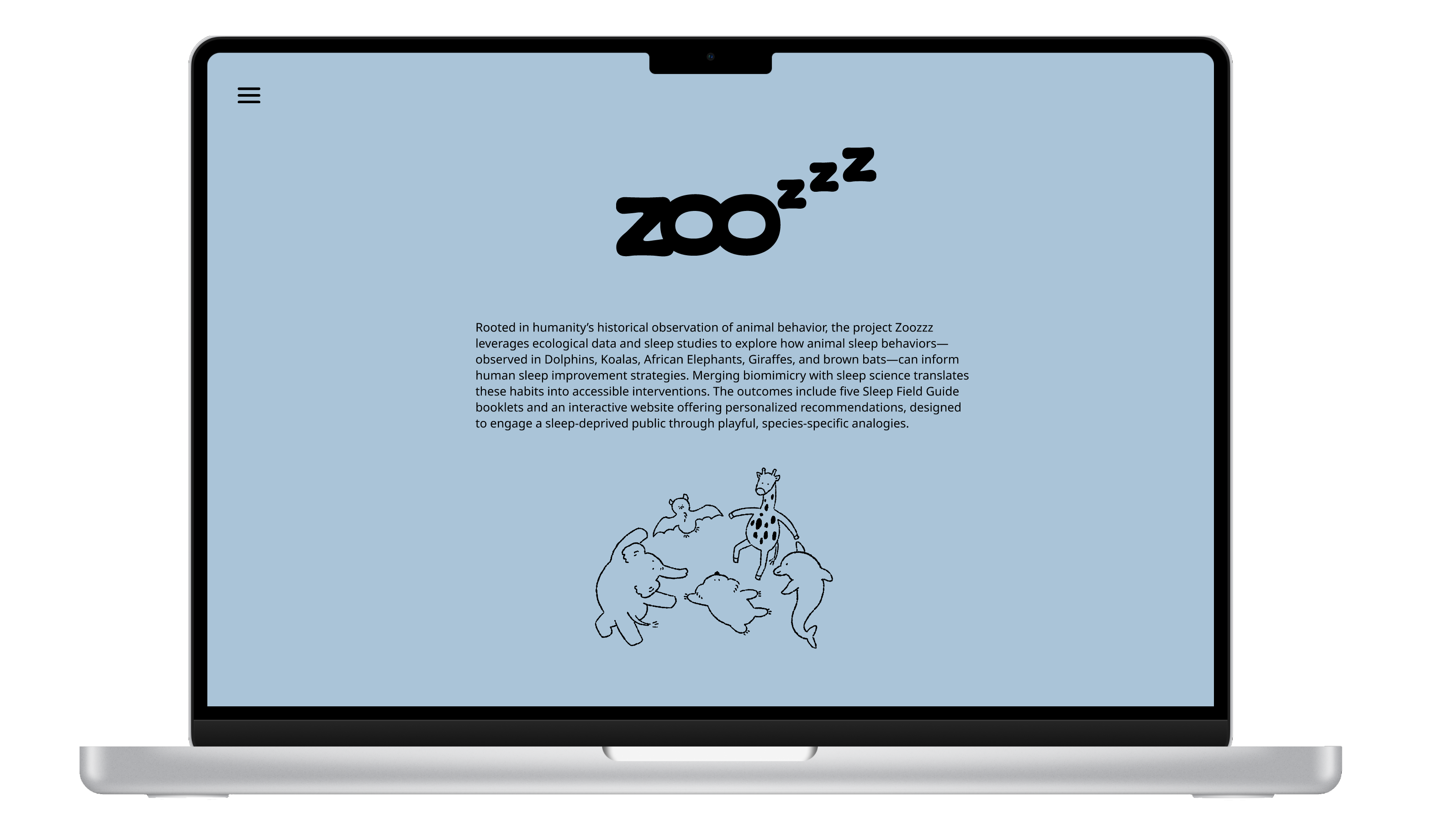 Rooted in humanity’s historical observation of animal behavior, this project leverages ecological data and sleep studies to explore how sleep behaviors observed in dolphins, koalas, African elephants, giraffes, and brown bats can inform human sleep strategies. Merging biomimicry with sleep science, Zoozzz translates these habits into accessible interventions.The outcomes include five Sleep Field Guides and an interactive website designed to engage a sleep-deprived public through playful, species-specific analogies.